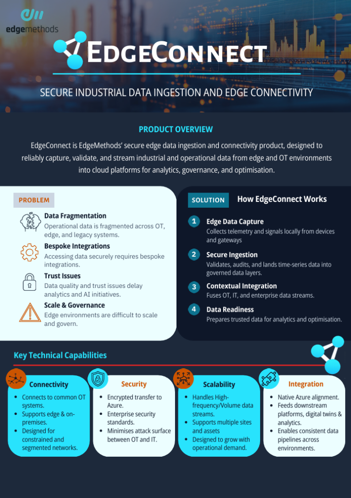 EdgeConnect captures, validates, and standardises data from devices, gateways, OT systems, and edge environments — turning fragmented, delayed, or unreliable telemetry into complete, cloud-ready data for analytics, digital twins, and AI.